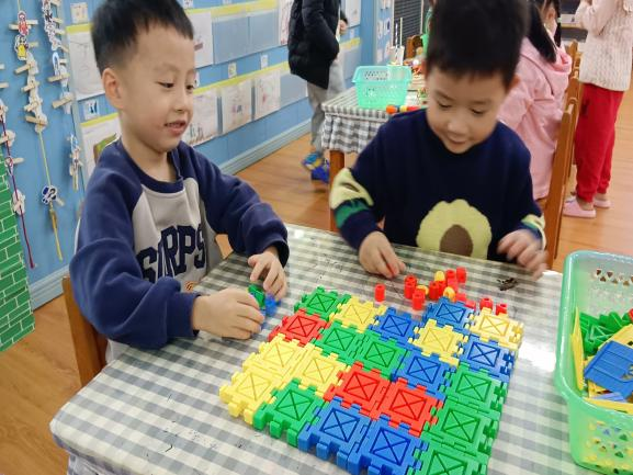 今天在室内自主游戏中,我观察到了陈俊志、符家豪拿着塑料搭拼玩具来到桌子边,他们一起把塑料玩具平摊成一个方形的形状,再选来蓝色、绿色、红色、黄色的珠子,他们就坐下来,俊志选蓝色的珠子当棋子,家豪选红色的珠子当棋子,他们玩起下棋的游戏。他们一直玩到游戏时间结束。
