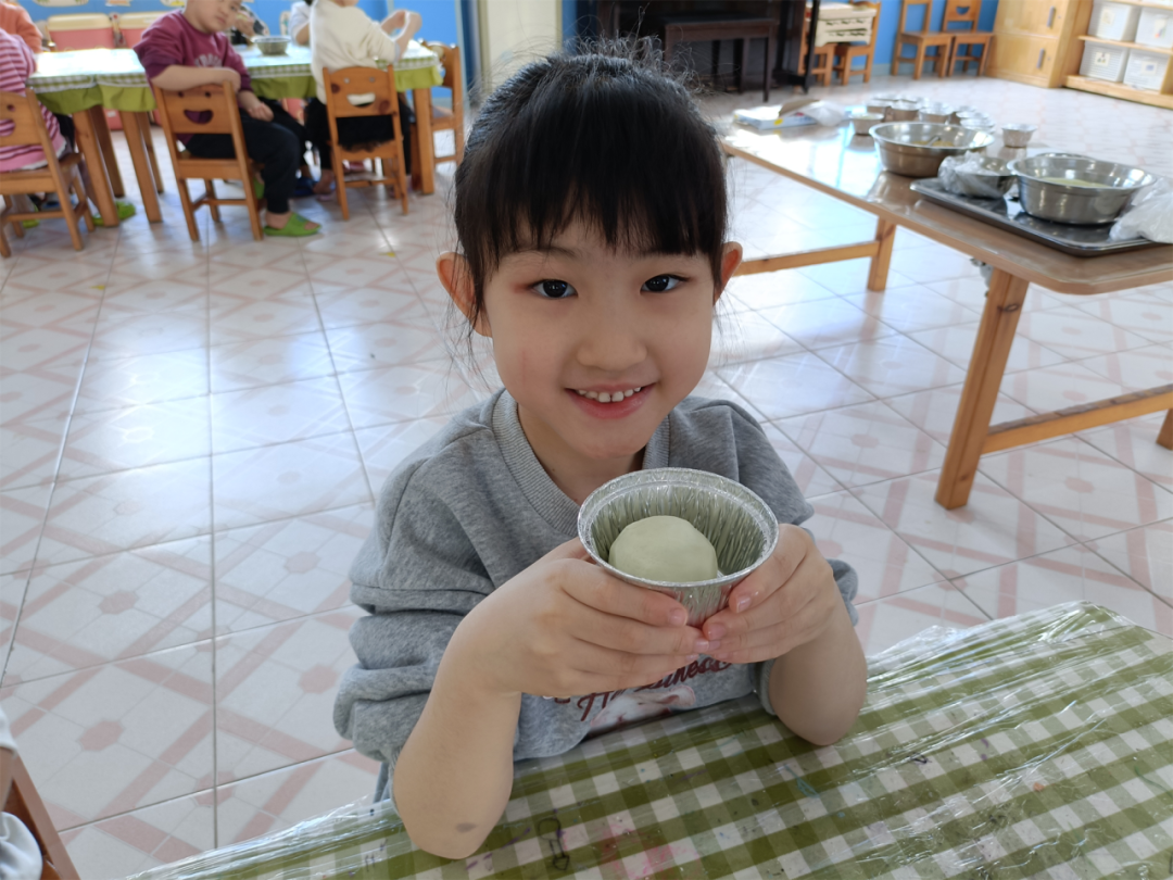 孩子们在老师的指导下,好奇又兴奋地学着揉面团、包馅料,小手虽然不太灵活,但个个干劲十足。不一会儿,形态各异的青团就摆满了盘子,大家看着自己的成果,脸上洋溢着成就感的笑容,在制作过程中,孩子们了解到青团作为清明节传统美食的意义,品味到传统节日的独特韵味。