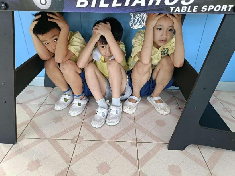 随着第一声警报声响起,地震演练正式开始。正在教室活动的孩子们在老师的引导下,迅速做出反应,以最快的速度躲到桌子下、墙角边等安全区域,双手抱头,蜷缩身体,进行紧急避险。