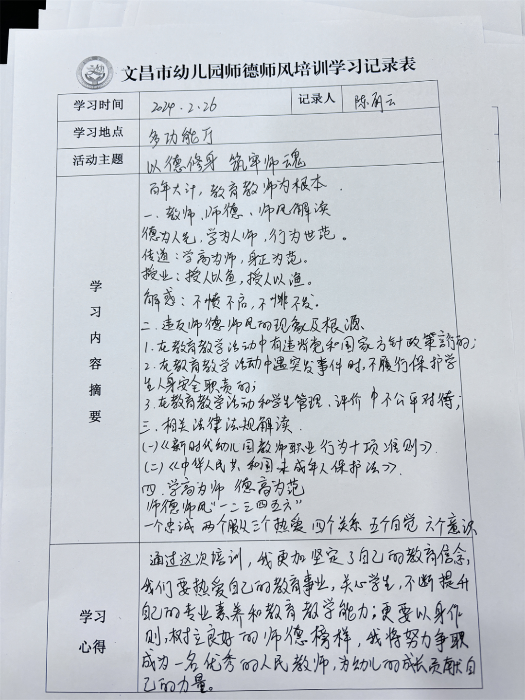 本次培训,教师们认真听,仔细记,并进行自我剖析,对良好师德师风的树立有了新的认识和体会,大家纷纷表示,今后时刻以师德规范鞭策自己,立德树人,积极投身幼儿教育这个大家庭中。