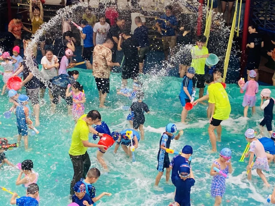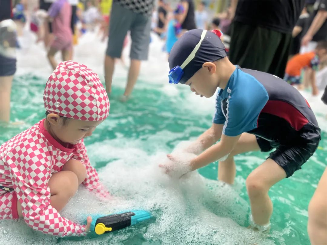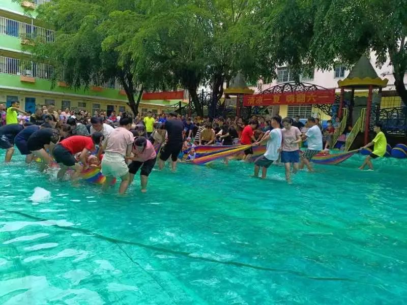 泡泡机马力全开,“从天而降”的泡泡铺满水池,孩子们仰望着空中的泡泡,好像被雪白的云朵包围着,脸上洋溢着幸福的笑容。“球来了,快接住,打回去......”振奋人心的水上排球赛上线啦!幼儿园里充满了家长和孩子们的欢声笑语,大家在轻松愉快的氛围中享受游戏带来的快乐。