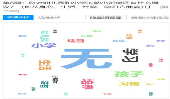从第8题的建议内容统计结果来看,家长们主要关注幼小衔接的学习和生活方面,建议加强孩子的学习习惯养成,提前培养孩子的学习能力,适当加强识字、阅读等方面的训练,同时也关注孩子的生活习惯养成,提倡独立、安静、认识事情等方面的培养。