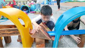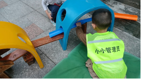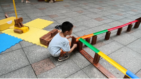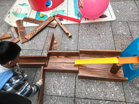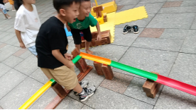 在一次户外自主游戏中,周安毅手持乒乓球从阶梯上滑落,这一幕激发了致逸的创意火花:“我们来搭建一条滚珠轨道,让球沿着轨道滑落吧。”孩子们的想象力和创造力在这一刻被点燃,一个新的游戏玩法在他们的脑海中孕育而生。