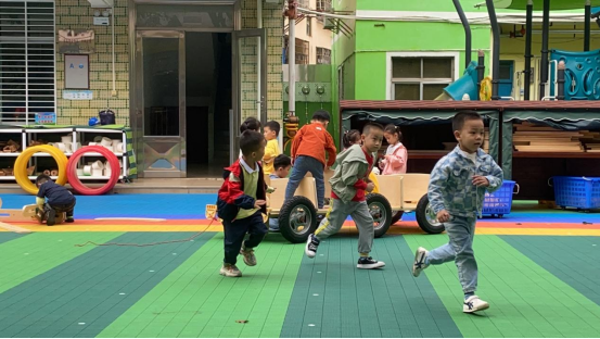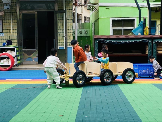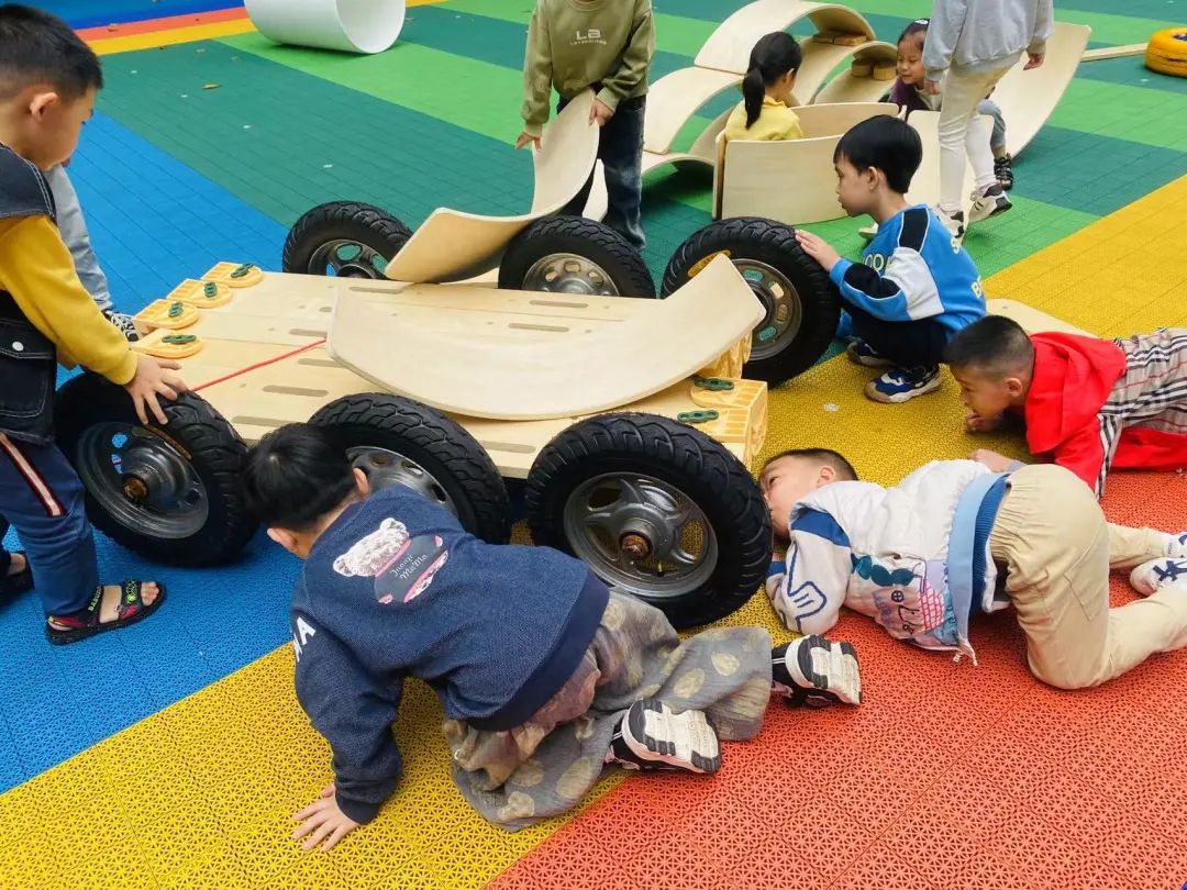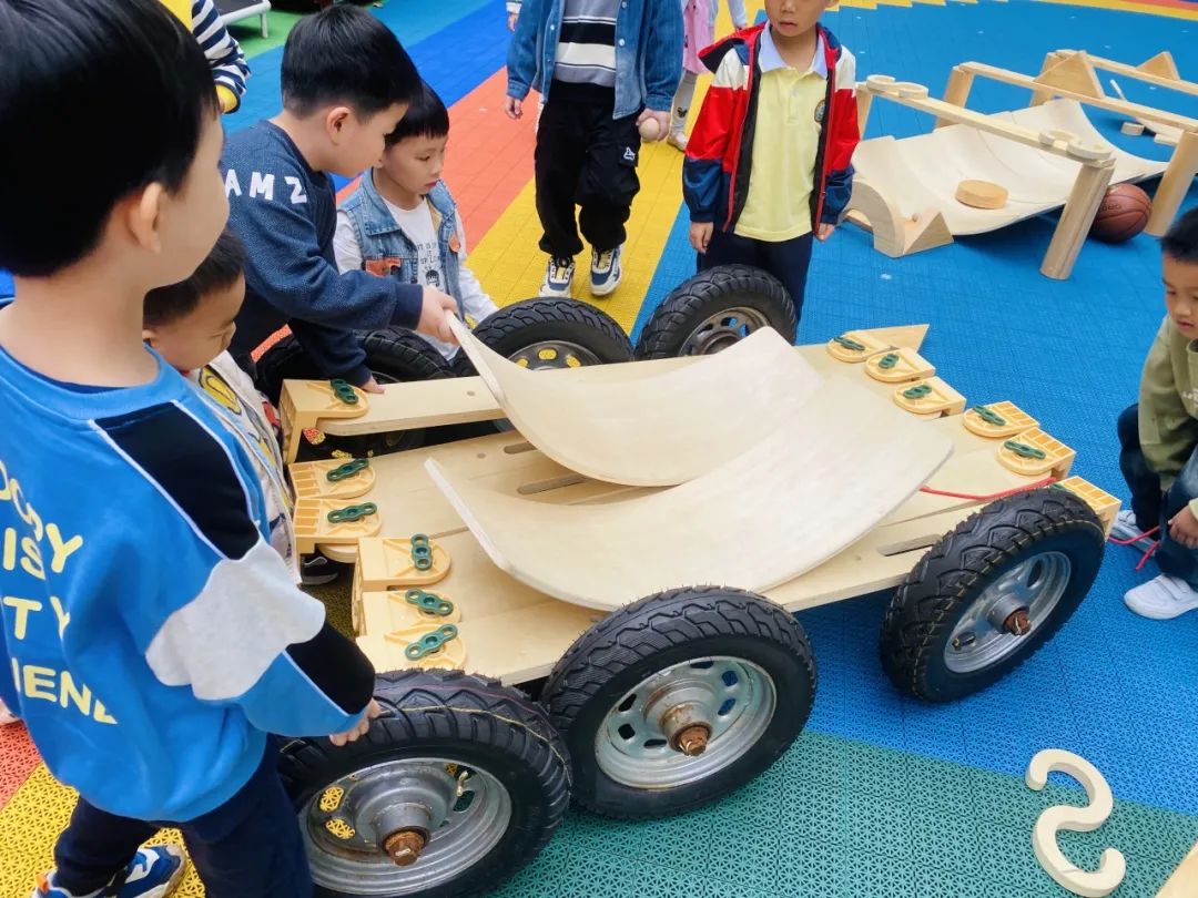 孩子们你一言我一语,每个人都在为搭建小汽车出谋划策。他们的想法天马行空,创意无限。“小汽车的搭建活动在孩子们的欢声笑语中如火如荼地进行着。大家分工明确,有的负责运送U型板,有的负责滚轮胎,还有的搬运木板,不一会儿,一辆初具规模的小汽车就呈现在大家眼前。”