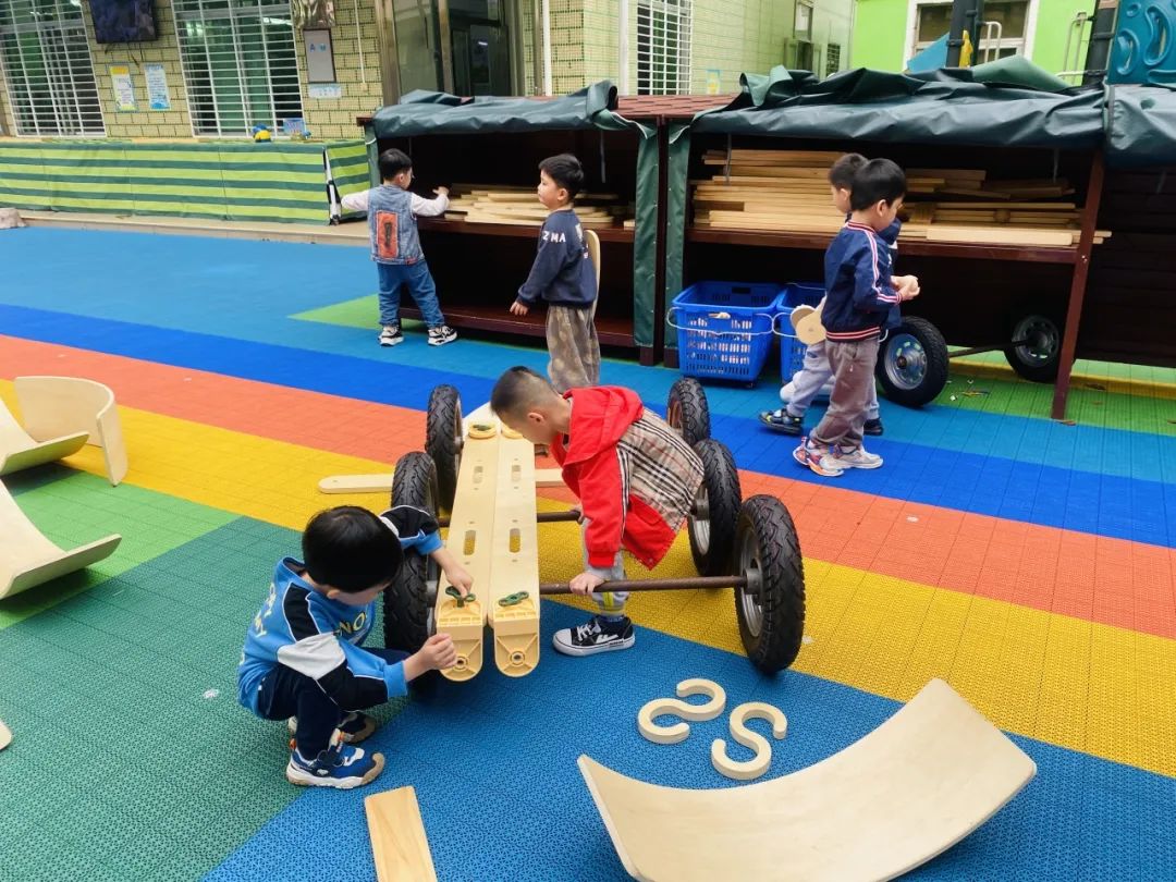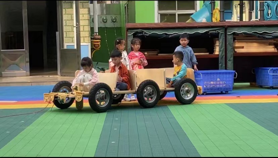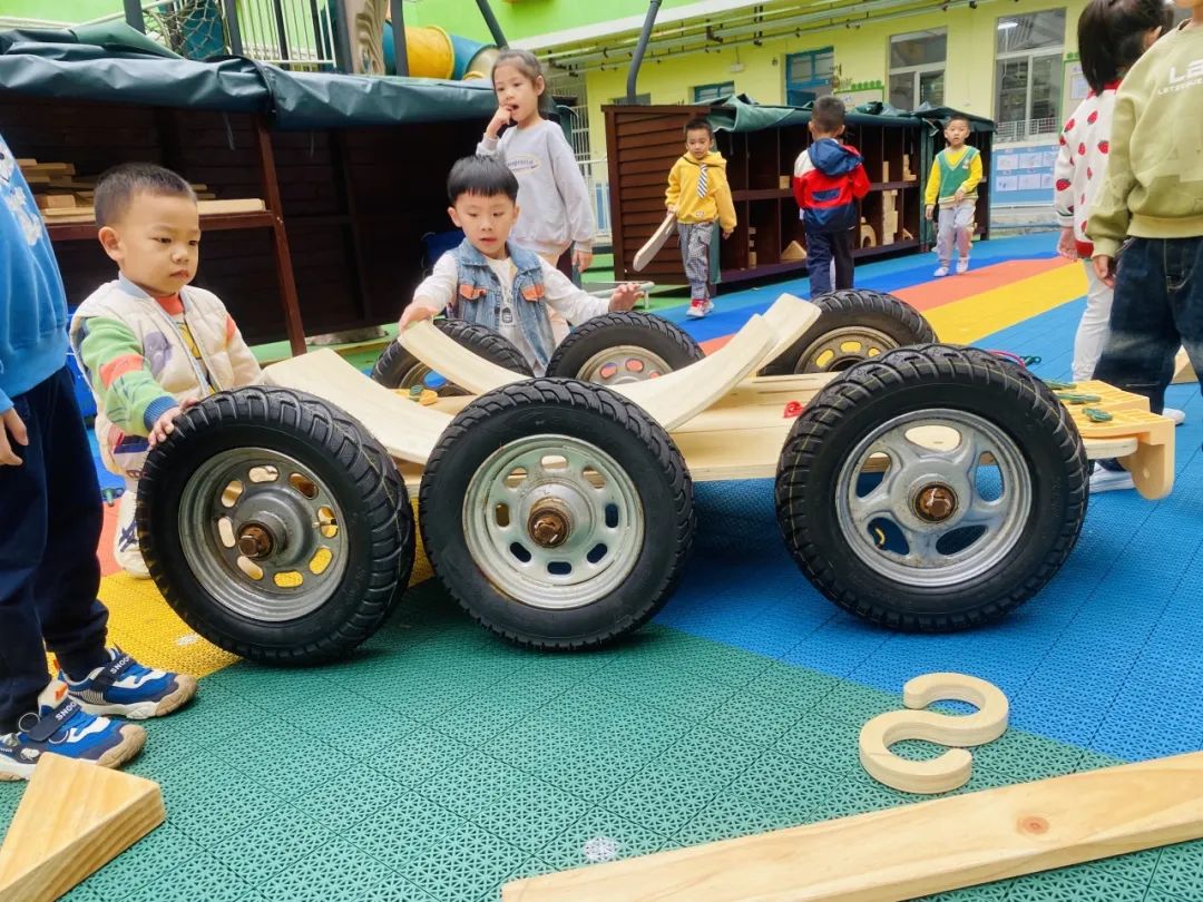 "我有个好主意,我们可以用木板来搭建车身。"符朗齐小朋友机智地提议。