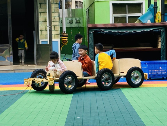 在林师兴的带领下,孩子们分工合作,有的负责找材料,有的负责搭建,有的负责装饰。大家齐心协力,很快就搭建出了一辆造型独特、功能齐全的小汽车。看着自己亲手搭建的小汽车,孩子们的脸上洋溢着自豪和满足的笑容。他们互相击掌庆祝,分享着成功的喜悦。这次户外自主游戏不仅锻炼了孩子们的动手能力,更培养了他们的团队协作精神和创新思维。