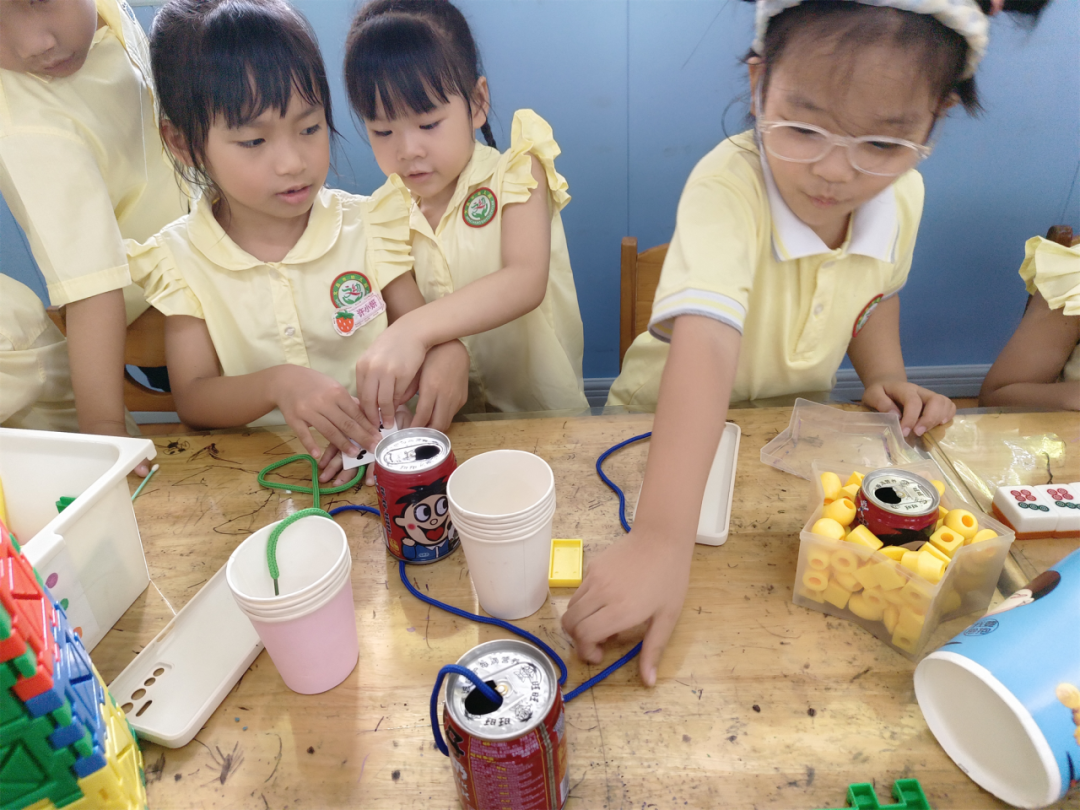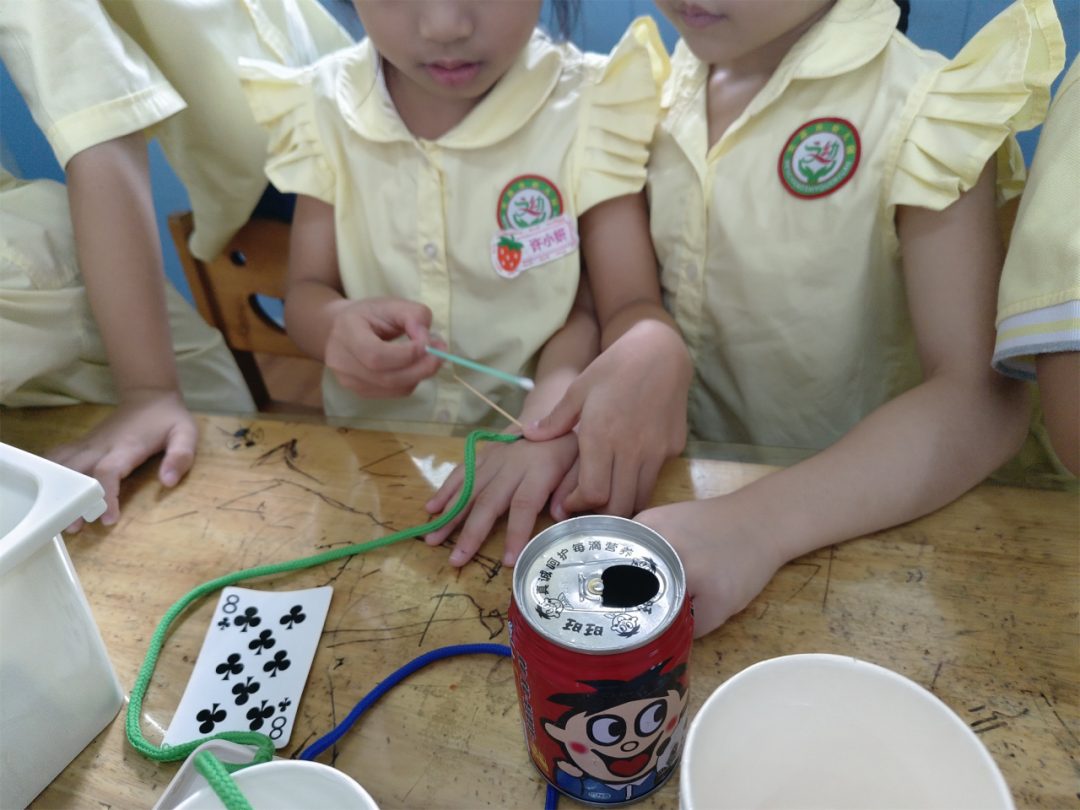 孩子们经过了讨论,在第二次医生游戏中,觉得要根据不同的病情需要不同的道具,就比如普通的感冒就打针,如果严重的话要打吊针,第二次的游戏孩子们又新增了绳子用来当输液的管子,还有拿旺仔易拉罐当做吊瓶,而且还有意识地增加吊瓶的高度。许小妍给病人输液时,还想到要调针水的速度,于是又在绳子处用手拨了拨针管。