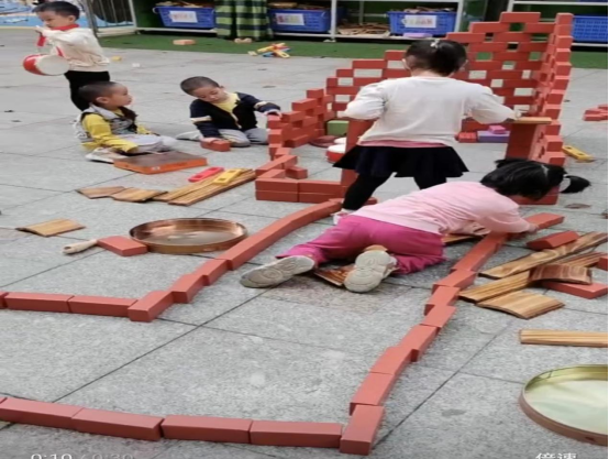在上庭院的游戏区,黄雯雯与彦心还有几位小朋友,商量着要一起盖房子,她们搬来红砖头,一边讨论一边搭建,先把红砖头平铺,一个叠着一个往上垒,大概垒了五层的墙,两边慢慢地围成了一个长方形大的房子,彦心说:房子要有门口的,要不然我们怎么进去呢?于是她们又在围墙的一边空出位置用来搭建门口,两边分别用5个砖头竖起来垒高当门,顶上还各放了一个瓦片,相当对称,门口的地板上还铺着一排瓦片当门槛,房子建好了,他们就开始在里面玩耍。