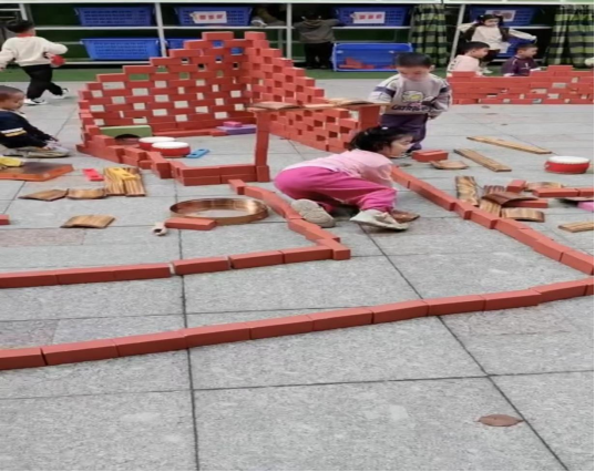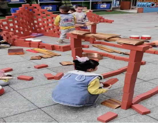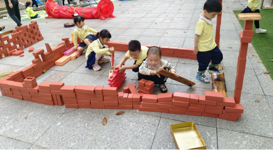 通过两次搭建的经历,孩子们总结出了更多的经验,从低墙壁的房子到高的有门顶的房子,游戏中他们有分工,有合作,有承担设计的主导者,也有参与搭建的协助者。对于中班孩子来说,合作性游戏较明显,同时对于搭建难度来说对幼儿具有挑战性。孩子们专注投入学习的品质以及解决问题的能力,也就在这样的游戏活动中得到了提升。